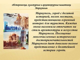 Документ описывает исторические, культурные и архитектурные памятники Мариуполя, подчеркивая богатое наследие города и его значимые здания. Приводятся подробные сведения о памятниках и братских могилах, увековечивающих память героев Советского Союза и жертв разных трагедий, включая Чернобыль и Голодомор. Особое внимание уделено архитектуре и исторической функции множества достопримечательностей, которые иллюстрируют развитие города.