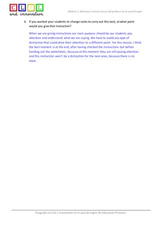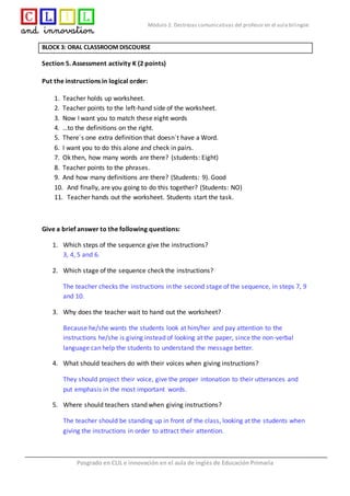 The document discusses assessment activity K which involves matching words to definitions on a worksheet. It provides the steps of the instructions in logical order: 1) the teacher holds up the worksheet, 2) points to the left side, 3) introduces the task of matching words to definitions, 4) points to where the definitions are, 5) notes there is one extra definition, 6) specifies doing it alone and checking in pairs. It then asks questions about the sequence: which steps give instructions and which check understanding, and why the teacher waits to hand out the worksheet. Finally, it discusses when the best time would be to give an instruction to change seats.