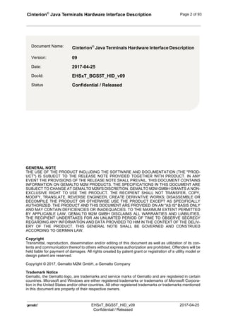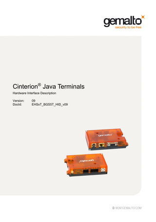 This document provides information on the hardware interfaces, electrical specifications, mechanical dimensions, and regulatory compliance of Gemalto's Cinterion Java Terminals, including the EHS5T-RS485, EHS6T USB, EHS6T LAN, and BGS5T USB models. It covers topics such as the RS-232, USB, GPIO, Ethernet, power supply, SIM, antenna, and status LED interfaces. Specifications for voltage, temperature range, packaging, and approvals are also included along with diagrams of the terminal circuitry, connectors, and dimensions. The document history notes recent additions of the EHS5T-RS485 model and updated information on regulatory compliance.