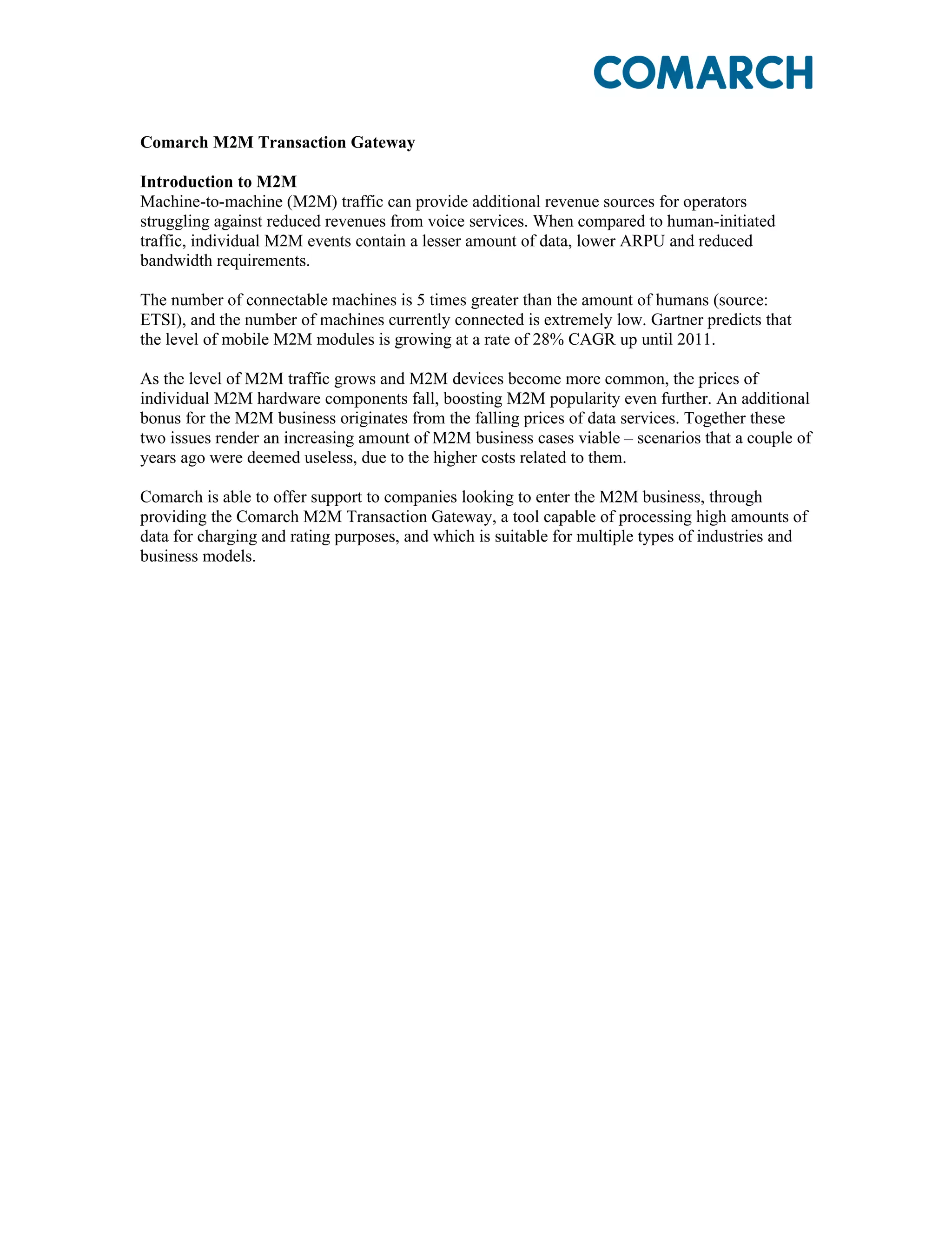 The Comarch M2M Transaction Gateway facilitates machine-to-machine (M2M) communications, enabling operators to tap into new revenue sources amidst declining voice service revenues. It supports high data processing volumes across various industries with flexible configuration and pricing models, making it suitable for both small and large enterprises. The gateway's capabilities include real-time data processing, customer invoicing, and robust integration options, designed to enhance M2M business operations.