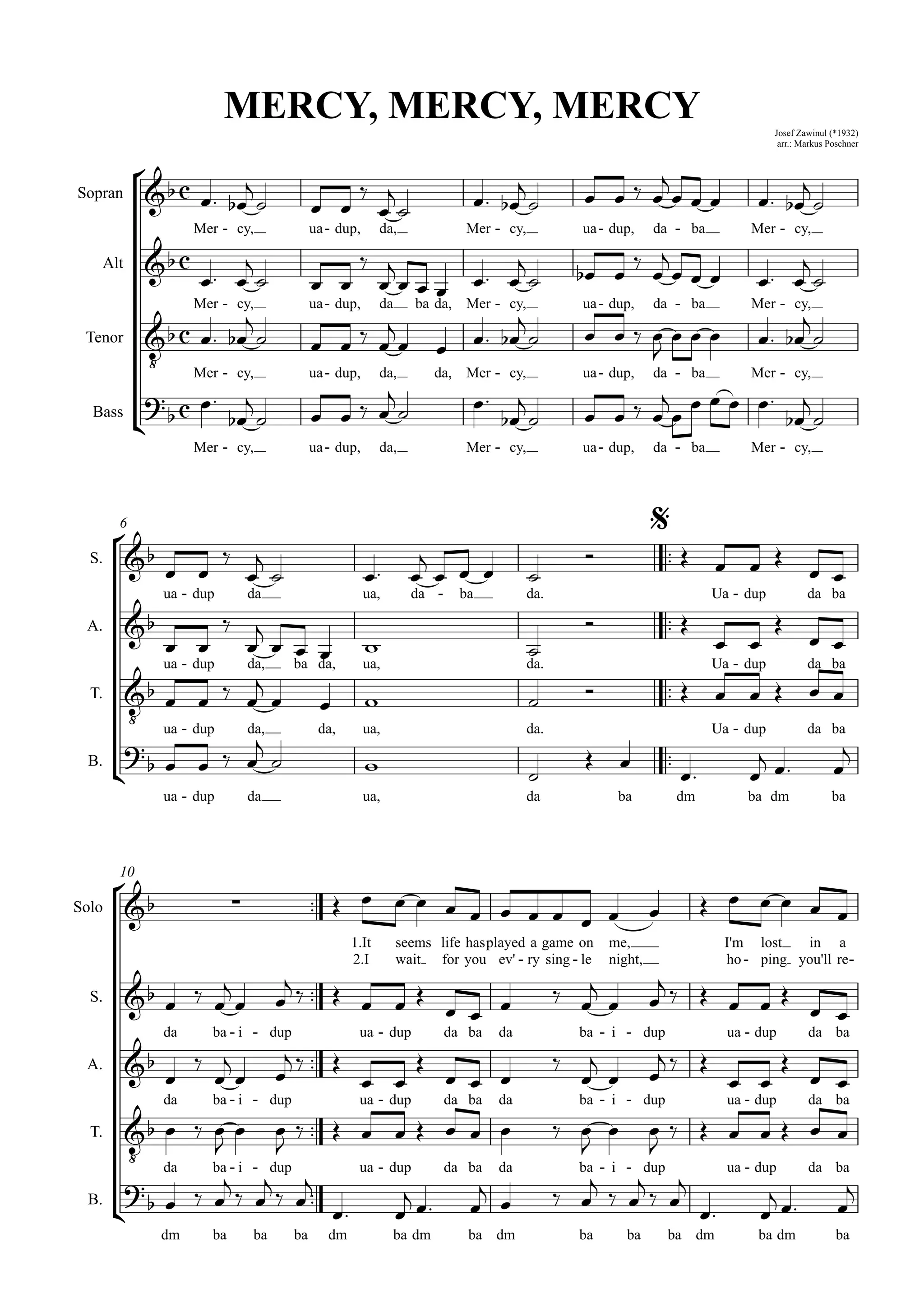 This musical composition is titled "Mercy, Mercy, Mercy" by Josef Zawinul. It features a soprano, alto, tenor and bass part that each sing variations on the lyrics "Mercy, mercy, mercy" over the course of the song. The lyrics plead for mercy and express heartache at a lost love that has turned away. It concludes with begging for mercy on bent knees and pleading to have mercy.