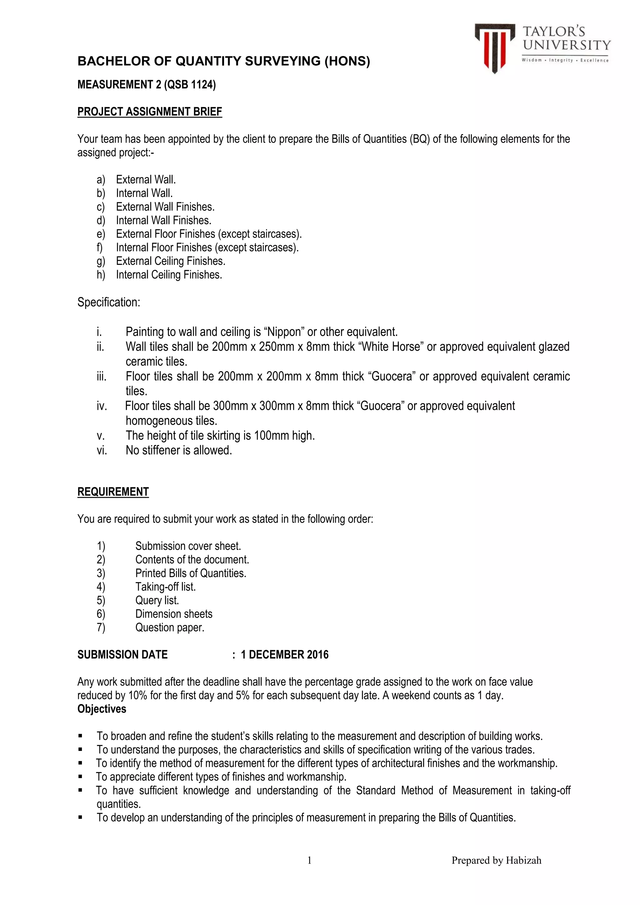 The document provides instructions for a project assignment to prepare bills of quantities for various elements of a construction project, including external walls, internal walls, flooring, and ceiling finishes. Students must submit their work, including bills of quantities, taking-off lists, dimension sheets, and a question paper, by December 1st. Late submissions will be penalized. The assignment aims to develop students' measurement and specification writing skills for architectural finishes. Plagiarism is unacceptable and students must acknowledge all sources and write their own original work.