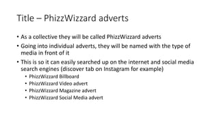 The document discusses planned components for advertising the PhizzWizzard drink targeted at the 30+ age group. It outlines several advert types including a video advert, magazine advert, billboard advert, and social media advert.