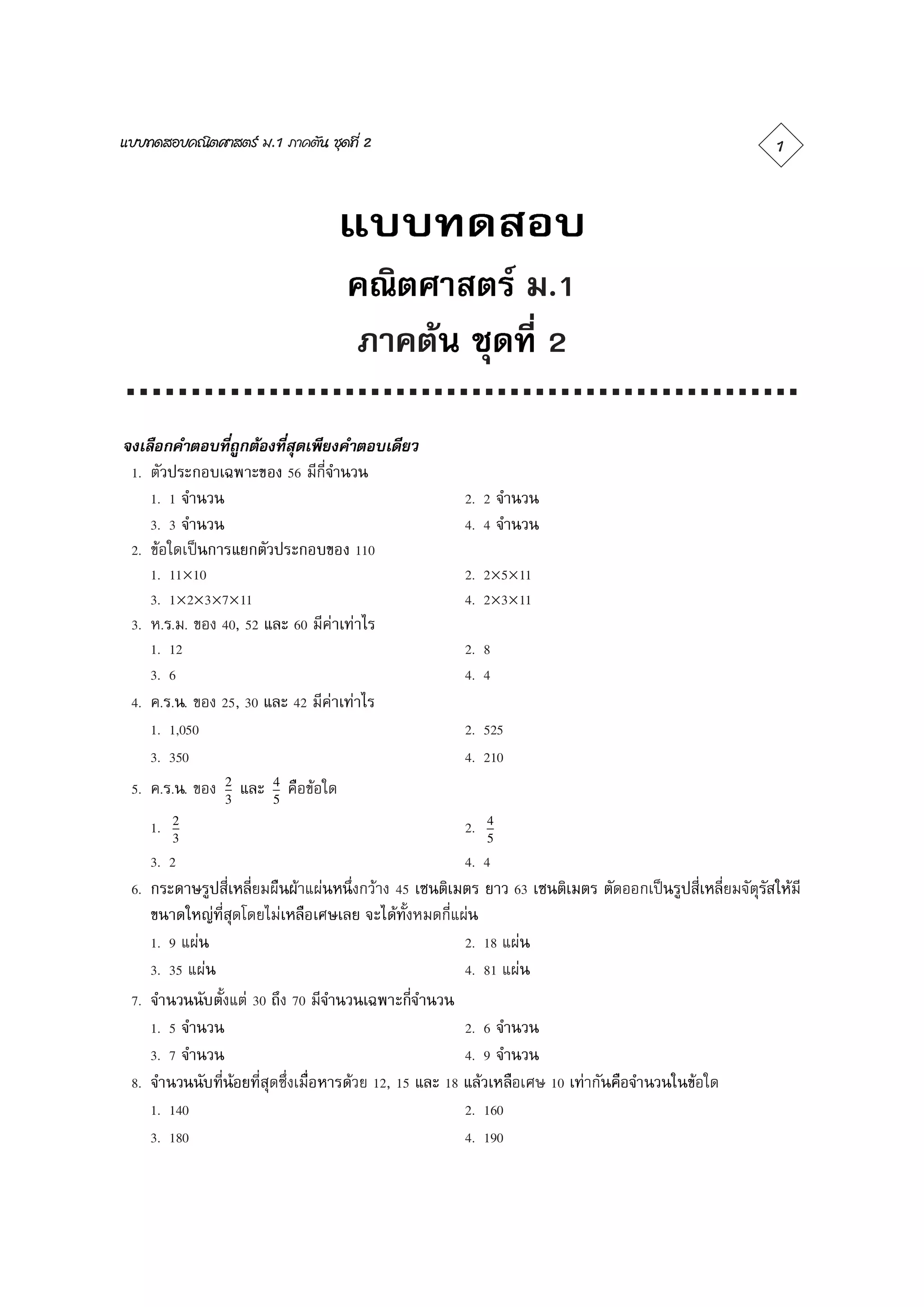 ข้อสอบคณิตศาสตร์ ม.1 เทอม 1 ชุดที่ 2