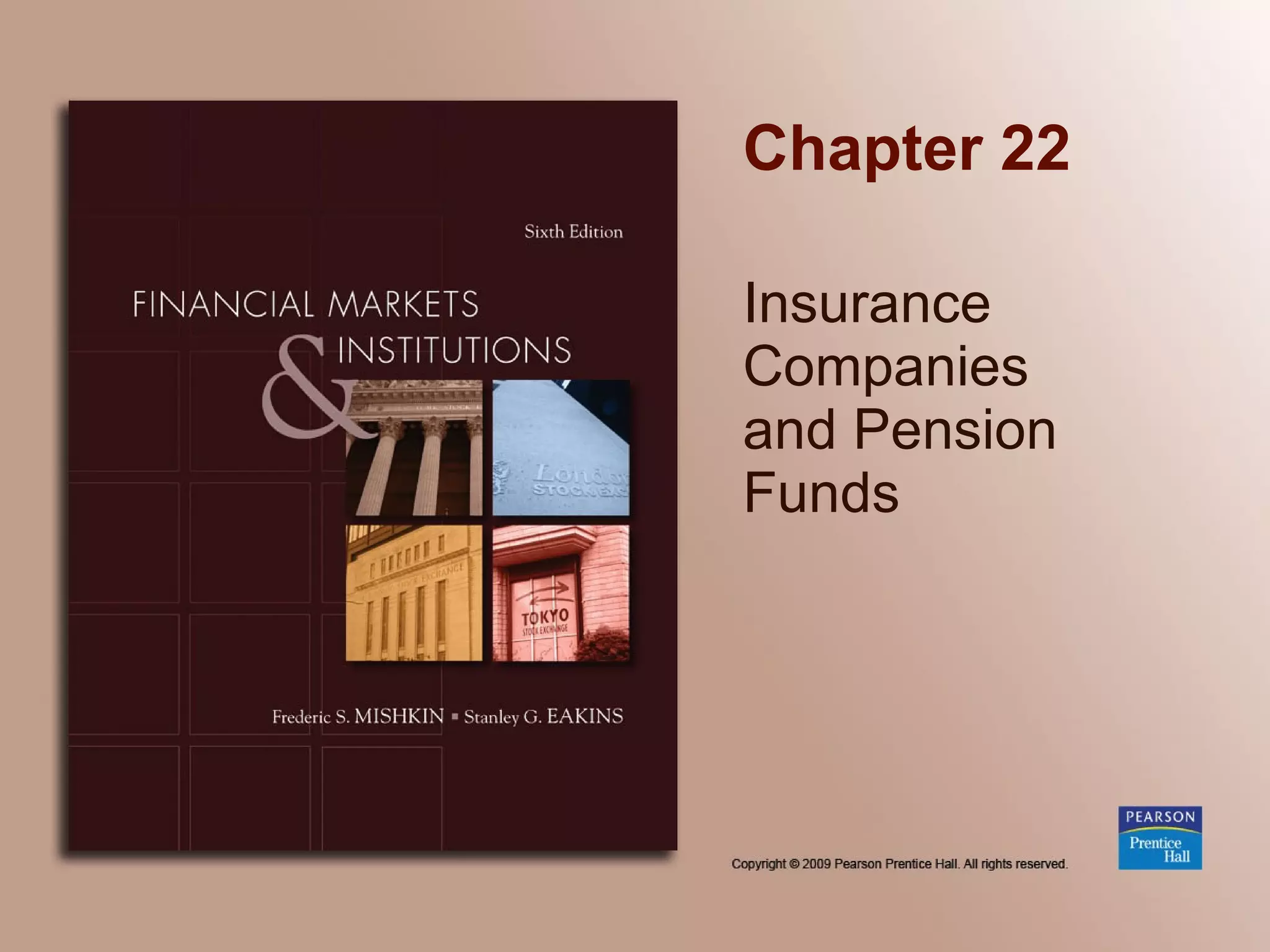 This document summarizes key topics related to insurance companies and pension funds. It discusses the fundamentals of insurance, types of insurance like life and health insurance, and how insurance companies are organized and regulated. It also covers the different types of pension plans like defined benefit and defined contribution, and how pension plans are regulated in the US by acts like ERISA.
