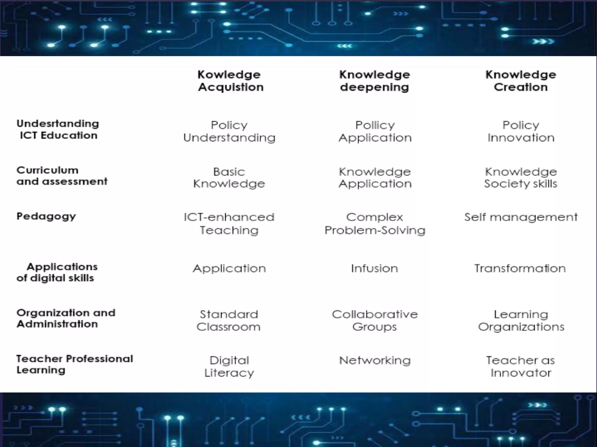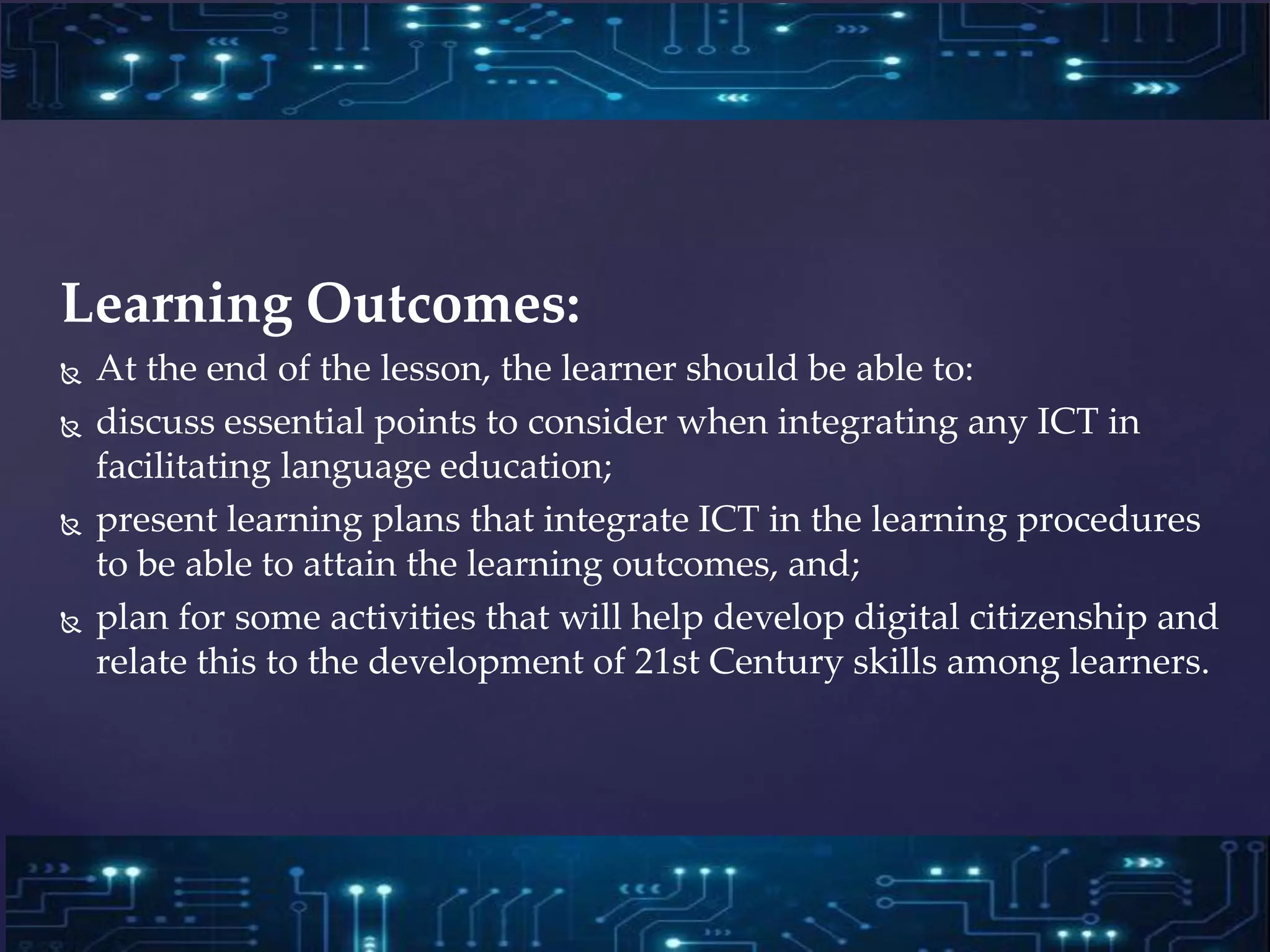 The document discusses the integration of information and communication technology (ICT) in language learning plans, emphasizing the need for teachers to engage educational technologies to enhance teaching and learning processes. It outlines learning outcomes related to ICT integration, key principles from various educators, and frameworks for implementing ICT in instruction, highlighting the importance of pedagogy, social interaction, and technology. Furthermore, it references UNESCO's ICT competency framework for teachers aimed at educational reform and sustainable development.