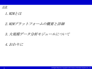 1.M2Mとは 2.M2Mプラットフォームの概要と詳細 3.大規模データ分析モジュールについて 4.おわりに 1 All Rights Reserved, Copyright © 2012 Science Information Systems Co., Ltd.