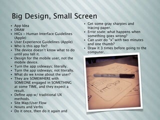 The document discusses various techniques for designing mobile applications, including: