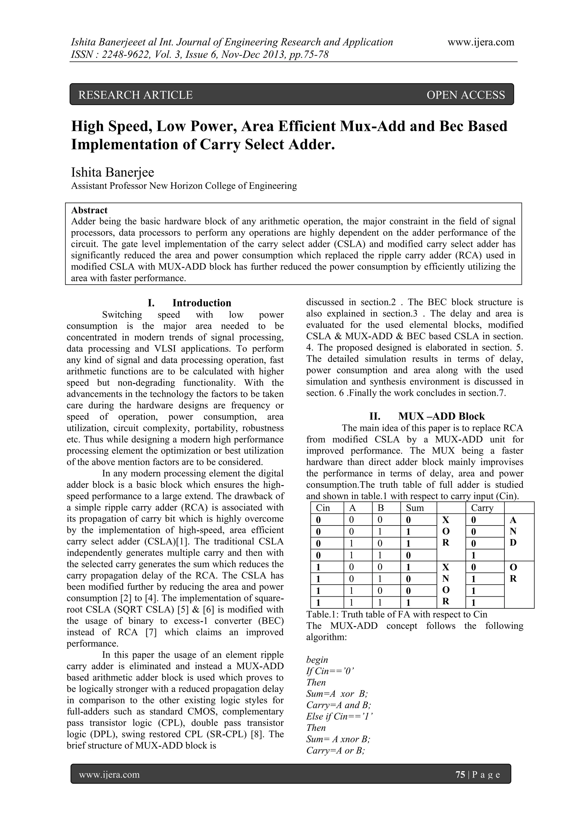 This research article presents a high-speed, low power, and area-efficient implementation of the carry select adder (CSLA) utilizing a mux-add and binary to excess-1 converter (BEC). The proposed design improves upon traditional adder architectures by significantly reducing power consumption and propagation delay while optimizing area usage, making it suitable for modern processing applications. Simulation results demonstrate a 48.3% improvement in power-delay product and a 34.63% reduction in delay compared to modified CSLA, confirming the design's efficiency.