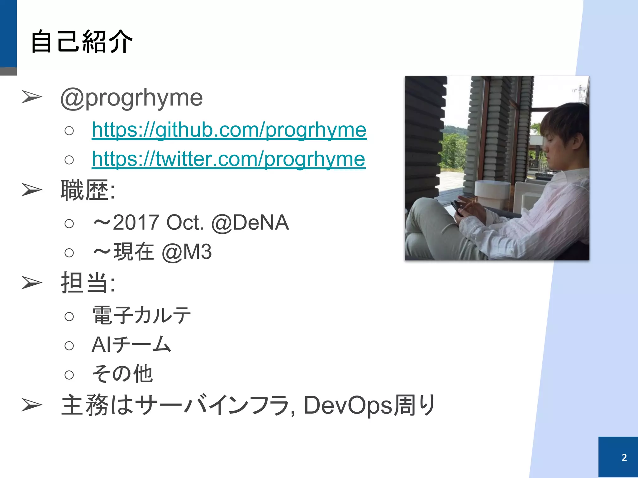 https://twitter.com/progrhyme ➢ 職歴: ○ 〜2017 Oct. @DeNA ○ 〜現在 @M3 ➢ 担当: ○ 電子カルテ ○ AIチーム ○ その他 ➢ 主務はサーバインフラ, DevOps周り 2