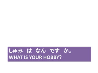 This document discusses how to ask about someone's hobby in Japanese. The phrase "しゅみはなんですか" means "What is your hobby?". You can also ask about other people's hobbies by using the possessive particle "の", such as "せんせいのしゅみはなんですか" meaning "What is the teacher's hobby?". The document provides examples of asking if someone's hobby is a particular activity by adding the question marker "か" to the end of a statement.