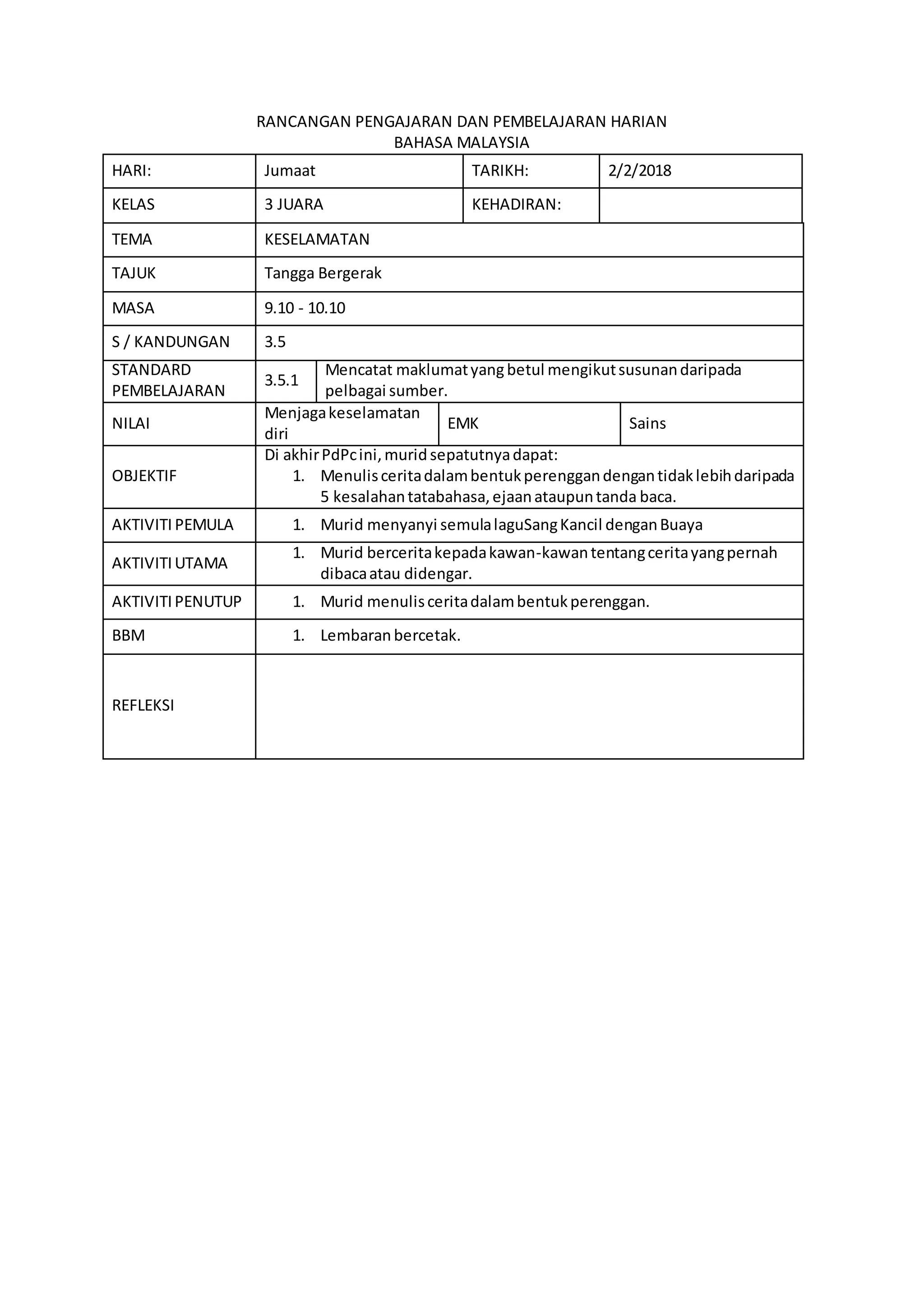 Rangkaian pengajaran dan pembelajaran harian untuk kelas 3 juara pada hari Jumaat, 2 Februari 2018 berfokus pada tema keselamatan khususnya tajuk tangga bergerak. Murid diajar menulis cerita dalam bentuk perenggan dengan kurang dari 5 kesalahan ejaan atau tatabahasa. Mereka juga bercerita tentang pengalaman bacaan atau pendengaran lalu menyanyikan lagu tradisional.
