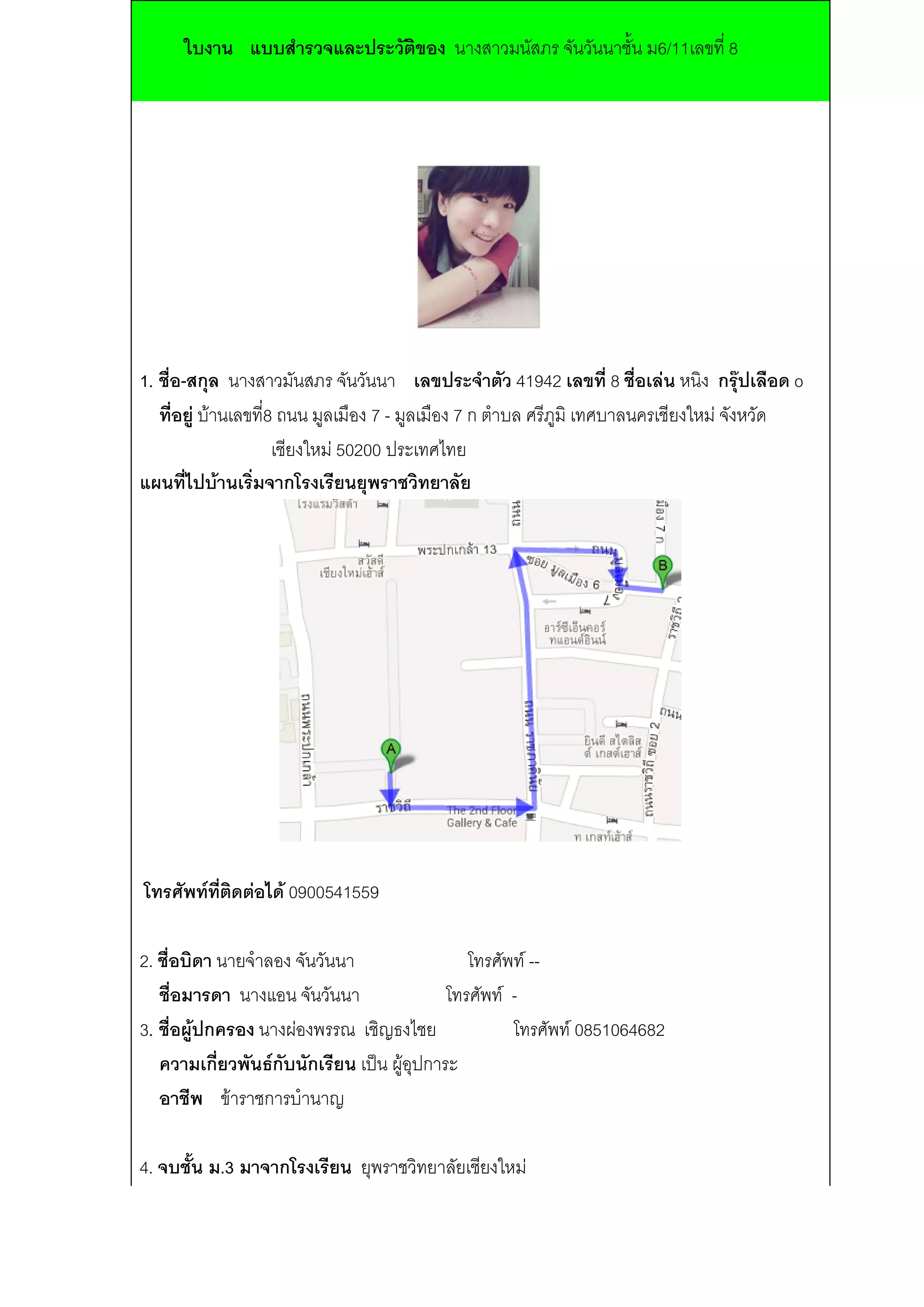 ใบงาน แบบสารวจและประวัติของ นางสาวมนัสภรจันวันนาชั้น ม6/11เลขที่ 8