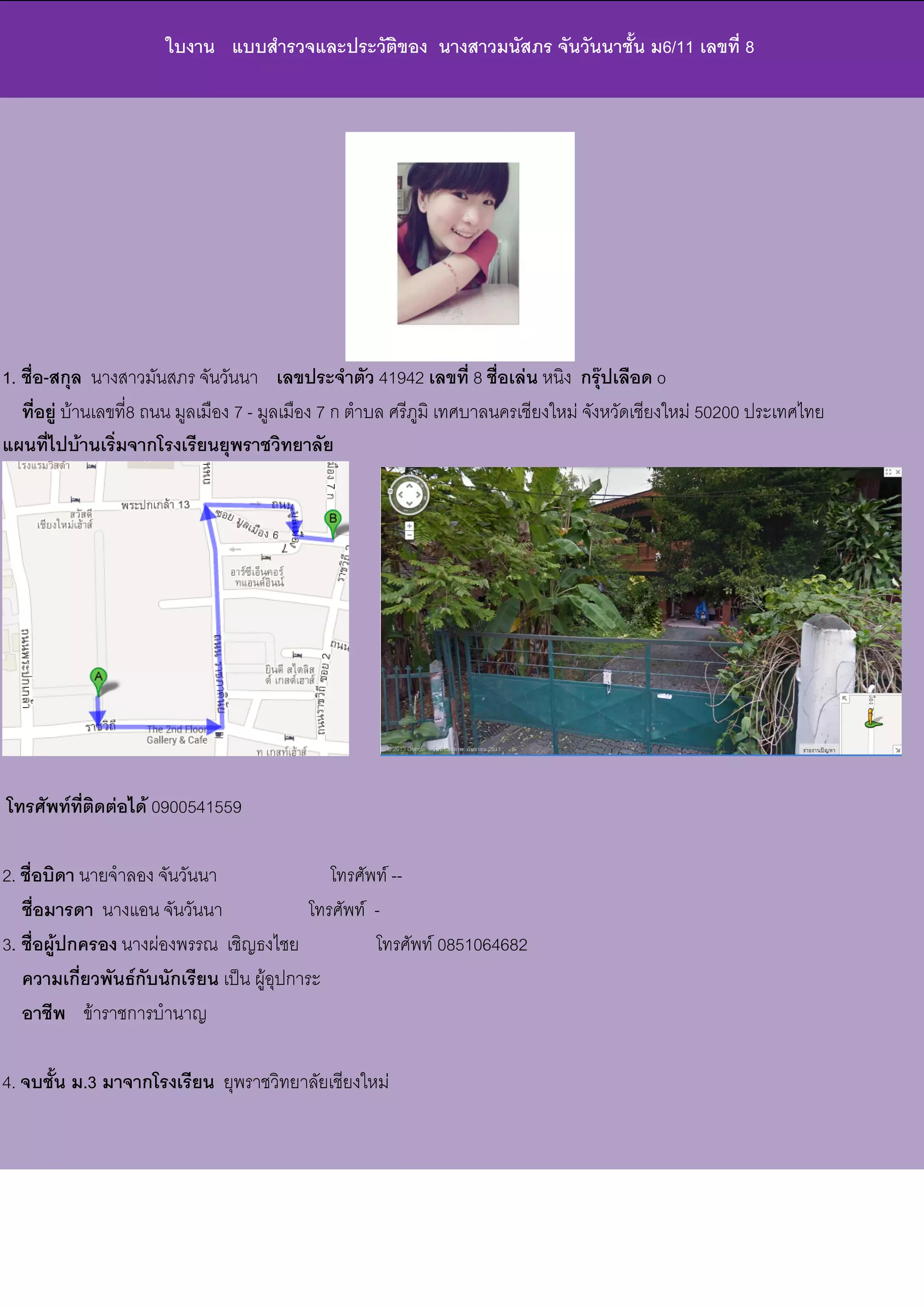 จันวันนาชั้น ม6/11 เลขที่ 8 1. ชื่อ-สกุล นางสาวมันสภร จันวันนา เลขประจาตัว 41942 เลขที่ 8 ชื่อเล่น หนิง กรุ๊ปเลือด o ที่อยู่ บ้านเลขที่8 ถนน มูลเมือง 7 - มูลเมือง 7 ก ตาบล ศรีภูมิ เทศบาลนครเชียงใหม่ จังหวัดเชียงใหม่ 50200 ประเทศไทย แผนที่ไปบ้านเริ่มจากโรงเรียนยุพราชวิทยาลัย โทรศัพท์ที่ติดต่อได้ 0900541559 2. ชื่อบิดา นายจาลอง จันวันนา โทรศัพท์ -- ชื่อมารดา นางแอน จันวันนา โทรศัพท์ - 3. ชื่อผู้ปกครอง นางผ่องพรรณ เชิญธงไชย โทรศัพท์ 0851064682 ความเกี่ยวพันธ์กับนักเรียน เป็น ผู้อุปการะ อาชีพ ข้าราชการบานาญ 4. จบชั้น ม.3 มาจากโรงเรียน ยุพราชวิทยาลัยเชียงใหม่