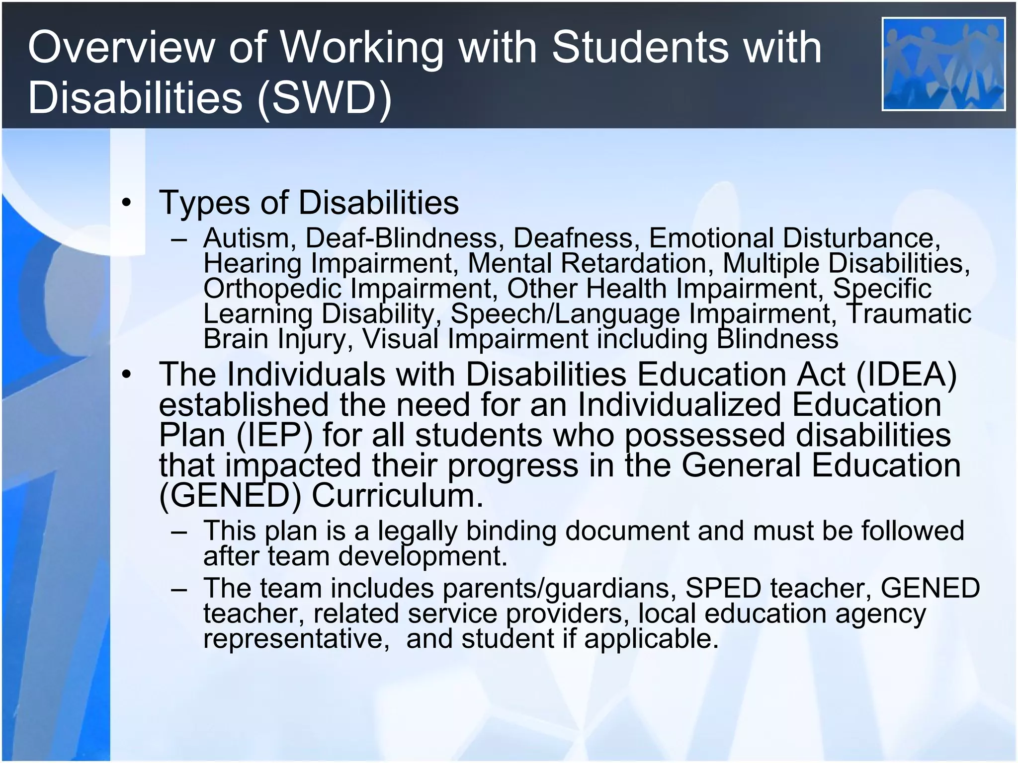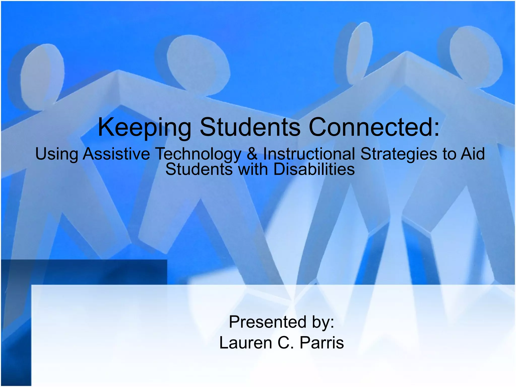 The document discusses assistive technology and instructional strategies that can aid students with disabilities. It provides an overview of different types of disabilities covered by IDEA and the components of an IEP. Examples of assistive technologies and instructional strategies are given for specific disabilities like ADHD, learning disabilities, auditory disabilities, and autism. Guidelines are outlined for selecting appropriate assistive technologies for students.