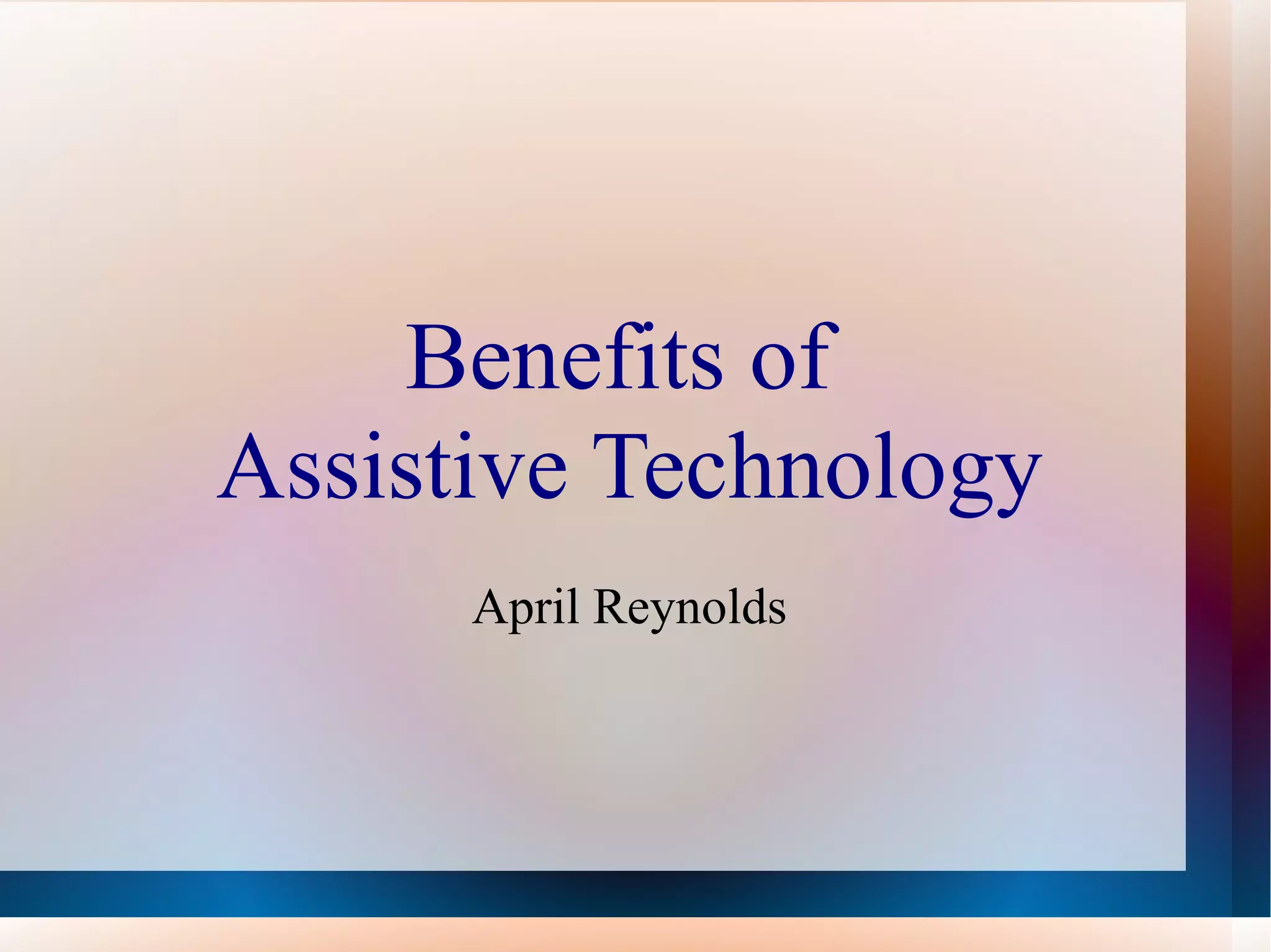 This document discusses assistive technology and how it can benefit students with special needs. It defines assistive technology as any item or equipment that helps increase, maintain, or improve the functional abilities of individuals with disabilities. Examples of assistive technology include modified keyboards, text-to-speech software, and augmentative communication devices. A six step process for finding the right assistive technology for a student is also outlined.