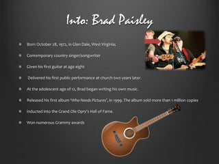 Brad Paisley, born on October 28, 1972, in West Virginia, is a renowned contemporary country singer/songwriter known for his musical talents from a young age and significant achievements, including multiple Grammy awards and induction into the Grand Ole Opry Hall of Fame. He has released several albums since his debut in 1999, with notable works in the country music genre. Paisley actively engages with his fans through social media and developed a smartphone app to enhance concert experiences, reflecting his commitment to connecting with his audience.