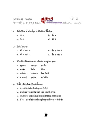 หนา ๓ วันอาทิตยที่ ๒๑ กุมภาพันธ ๒๕๕๓ เวลา ๐๘.๓๐ - ๑๐.๓๐ น. ๔. ขอใดมีอักษรต่ํานอยที่สุด (ไมนับอักษรที่ซ้ํากัน) ๑. ขอ ก ๒. ขอ ข ๓. ขอ ค ๔. ขอ ง ๕. ขอใดมีอักษรนํา ๑. ขอ ก และ ข ๒. ขอ ข และ ค ๓. ขอ ค และ ง ๔. ขอ ง และ ก ๖. คําในขอใดมีตัวสะกดมาตราเดียวกับ “เหตุผล” ทุกคํา ๑. พุดตาน ถอดถอน มลพิษ ๒. มดเท็จ คิดสั้น จัดการ ๓. ผลัดเวร บทกลอน โทษทัณฑ ๔. สวดมนต จุดออน ทรัพยสิน ๗. คําซ้ําในขอใดตองใชเปนคําซ้ําเสมอ ๑. คนงานใหมขยันเปนพักๆ เอาแนไมได ๒. นักเรียนอนุบาลหกลมหัวเขาแตก เลือดไหลซิบๆ ๓. งานนี้ถึงจะไดเงินเดือนนอย ก็ทําไปพลางๆ กอนแลวกัน ๔. ถาเราวางแผนใหดีตั้งแตแรกๆ โครงการนี้ก็คงสําเร็จไปแลว