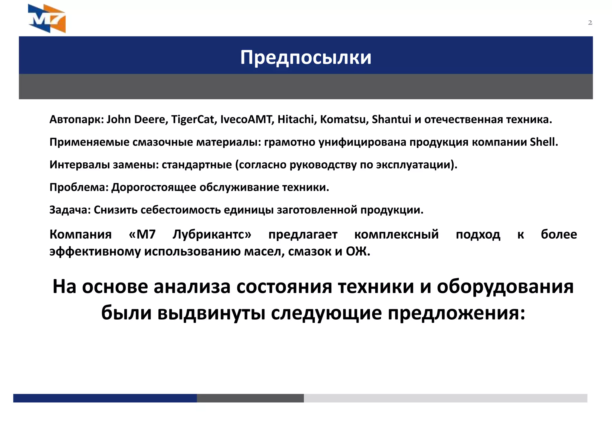 Документ описывает экономически обоснованный подход компании «м7 лубрикантс» к использованию смазочных материалов и охлаждающих жидкостей для различного автопарка, таких как John Deere и Komatsu, с целью снижения затрат на обслуживание техники. Приведены рекомендации по использованию масел, соответствующих стандартам, и предложены решения для различных моделей техники в условиях жесткой эксплуатации. Оценен экономический эффект более 600 000 рублей от перехода на альтернативные масла и фильтры.