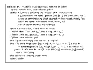 Logical agents use logical reasoning over a knowledge base to derive new information and make decisions. The document outlines key concepts in logic like syntax, semantics, entailment, and inference. It discusses representing the Wumpus world in propositional logic and using inference methods like forward and backward chaining to explore the world. Reasoning in the Wumpus world requires representing partial information and using propositional logic has limitations for complex, dynamic domains.
