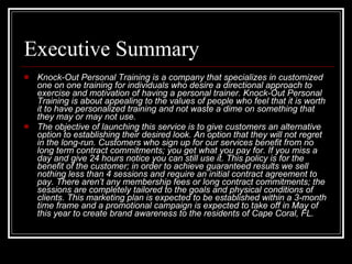 Knock-Out Personal Training is a new personal training studio in Cape Coral, FL that offers one-on-one customized training. The company aims to appeal to customers who value personalized attention from a trainer. Knock-Out's services include fitness evaluations, customized workout plans, and help monitoring diet and progress. The company plans to launch its marketing campaign in May and expects to establish itself in Cape Coral within three months, with a goal of expanding throughout Lee County by 2013.