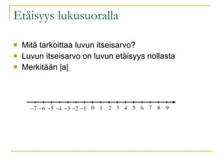 Funktio Esim. f(x)= 5 + 3x Laske f(10) Mitkä ovat funktion nollakohdat? Laske milloin f(x) = 5 +3x = 0 Miten piirrän funktion kuvaajan? (Laskimella ja ilman) Miten kuvaajasta näkee funktion nollakohdat? nollakohdat ovat kuvaajassa x-akselin leikkauspisteitä