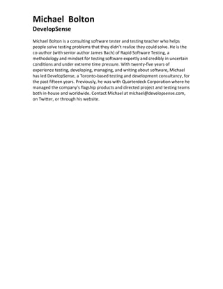 The document outlines a full-day tutorial on critical thinking for software testers, presented by Michael Bolton, who emphasizes the importance of critical thinking in software testing. It covers topics such as cognitive biases, assumptions vs. inferences, and the significance of diverse perspectives in testing. The goal is to equip testers with the necessary skills to identify and address problems in logic and decision-making processes within software testing contexts.