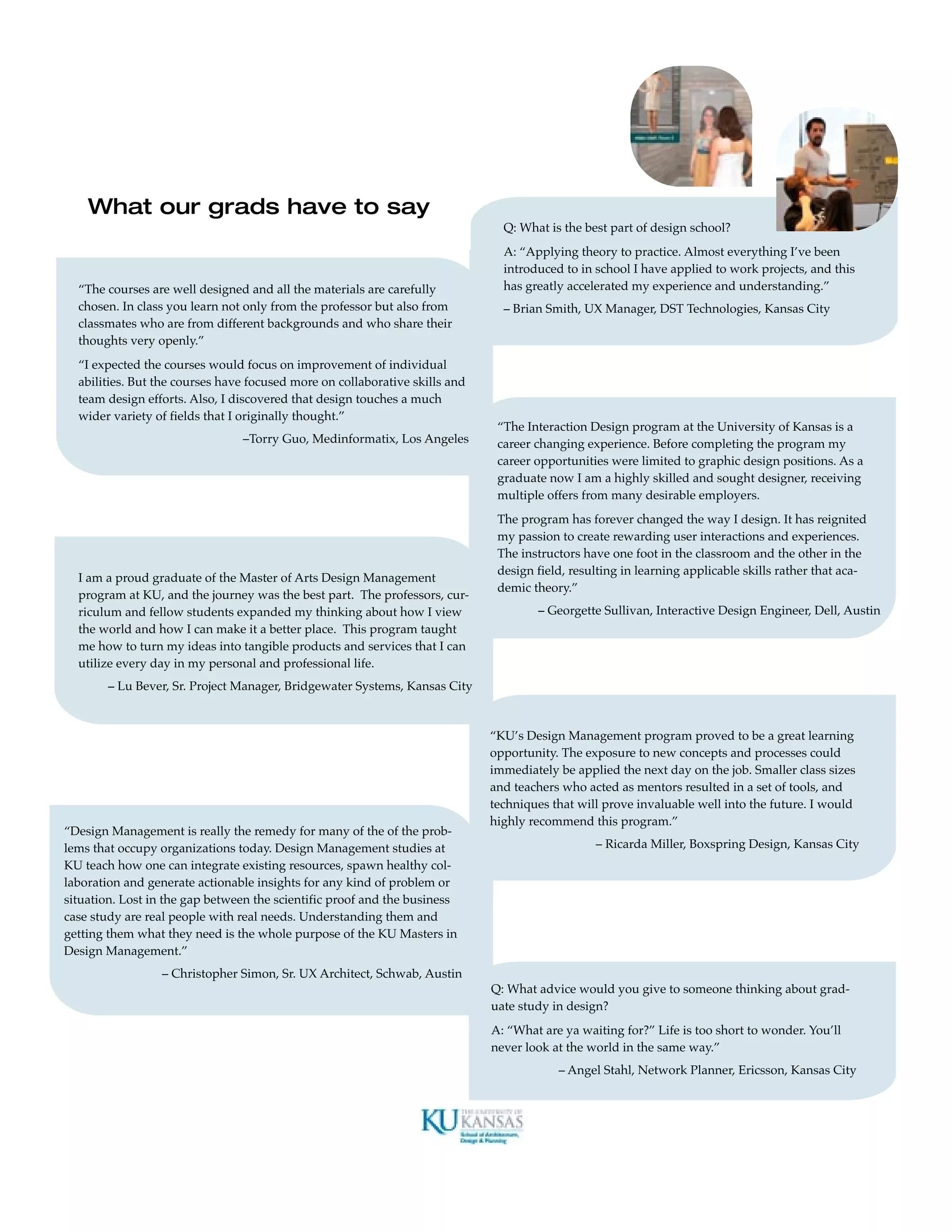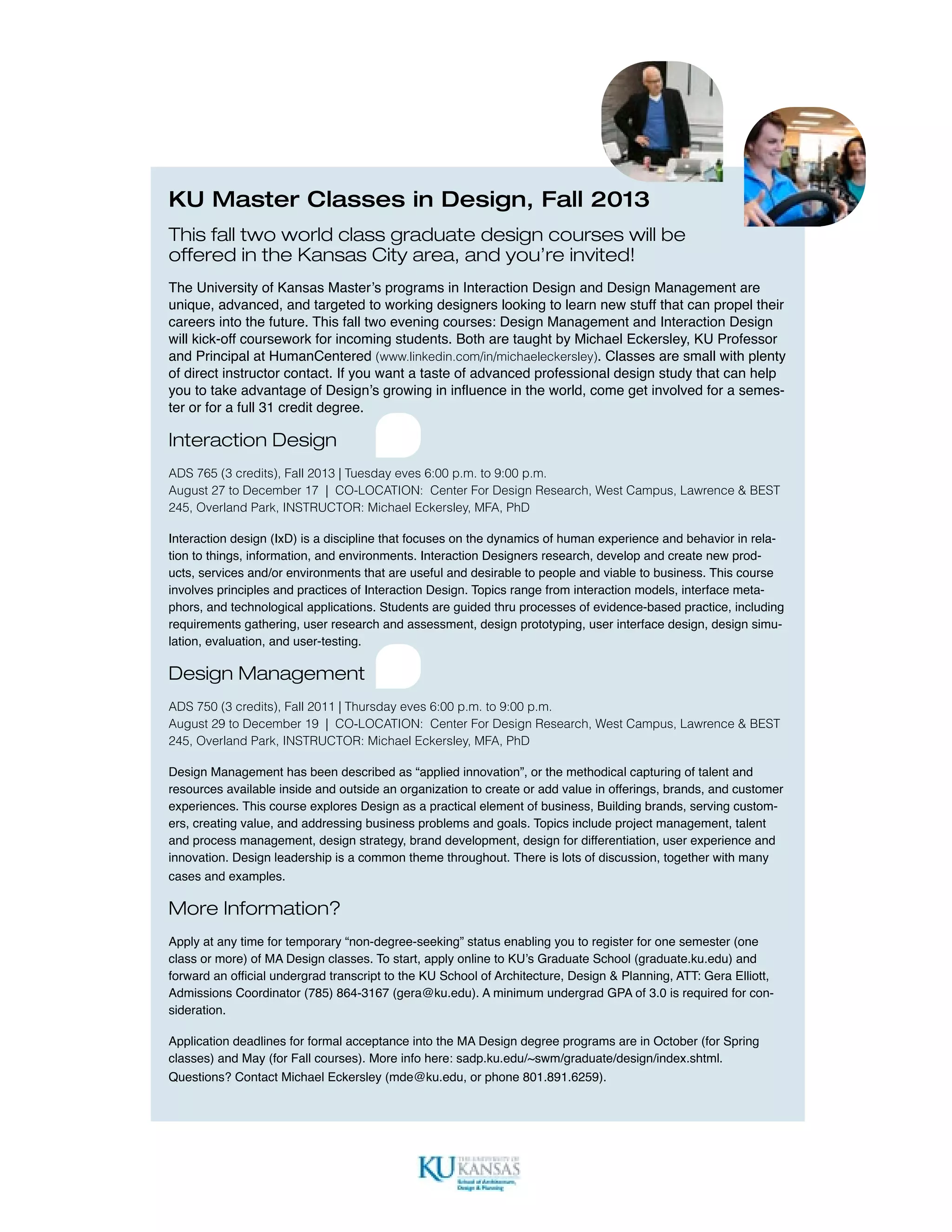 The document advertises two graduate design courses offered in the fall at the University of Kansas - Interaction Design and Design Management. The courses are taught by Professor Michael Eckersley and provide an opportunity for working professionals to advance their design skills and careers. The courses involve principles of interaction design and design management, respectively, and focus on applying theory to real-world practice through projects, cases, and examples. Testimonials from alumni highlight how the program expanded their thinking and ability to apply concepts on the job.
