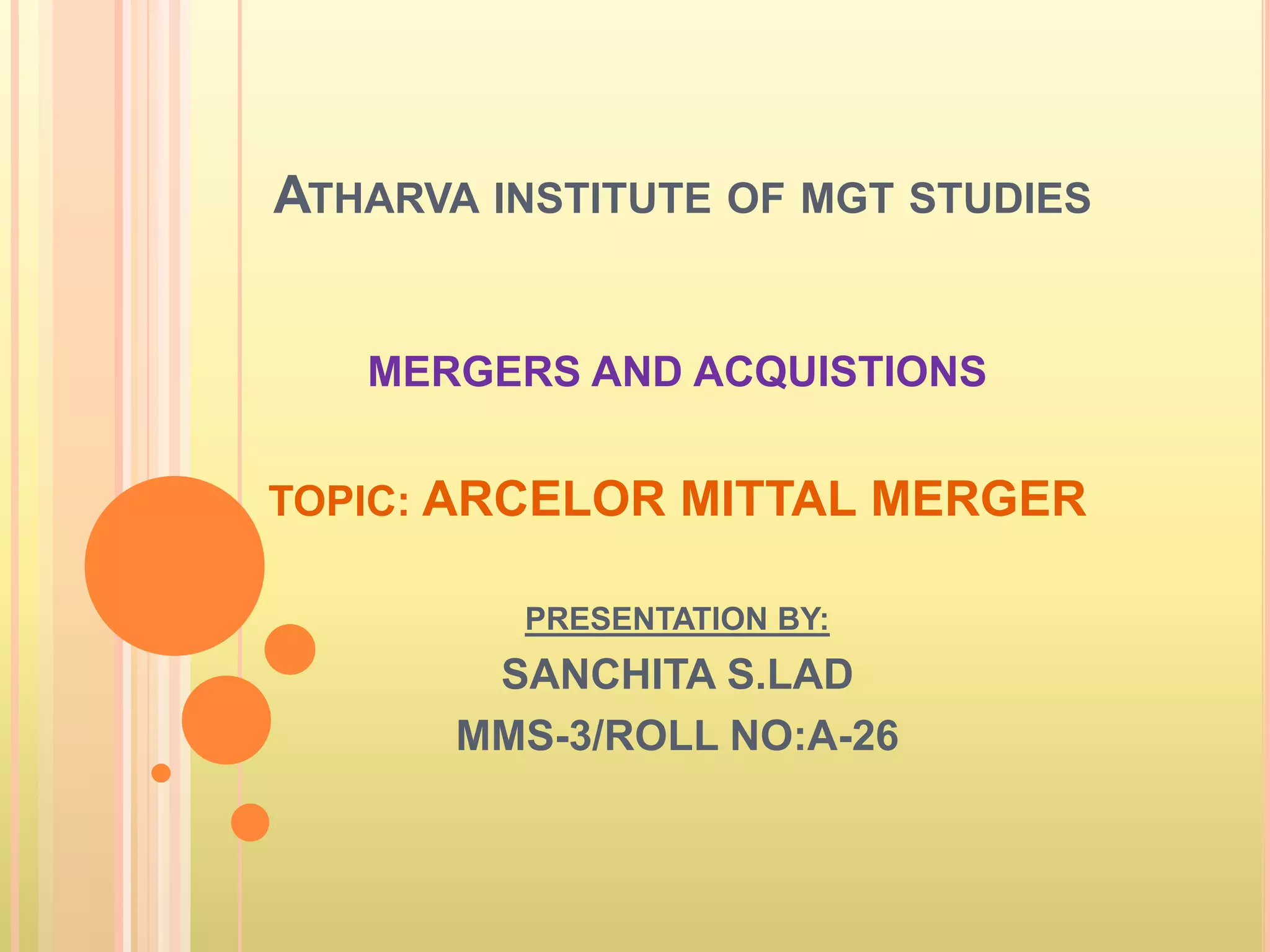 Arcelor Mittal is the world's largest steel company formed by the 2006 merger of Arcelor and Mittal Steel. Arcelor was the largest steel producer in Europe while Mittal Steel was one of the world's largest. The $33 billion merger combined the two companies to form ArcelorMittal with global steel production of 10% and over 300,000 employees. While the merger created scale efficiencies, the combined company struggled with integration challenges and was heavily impacted by the global recession in its early years.