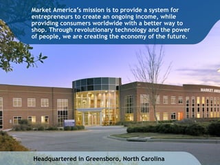 Market America is a product brokerage and internet marketing company founded in 1992 that specializes in one-to-one marketing. Through its UnFranchise business model, Market America allows individuals to earn income by selling Market America products and building a network of distributors. Distributors can earn commissions from retail profits and through Market America's compensation plan by developing sales and distribution organizations. The goal is to help entrepreneurs create ongoing income and provide consumers with exclusive products while creating the economy of the future through revolutionary e-commerce technologies and partnerships.