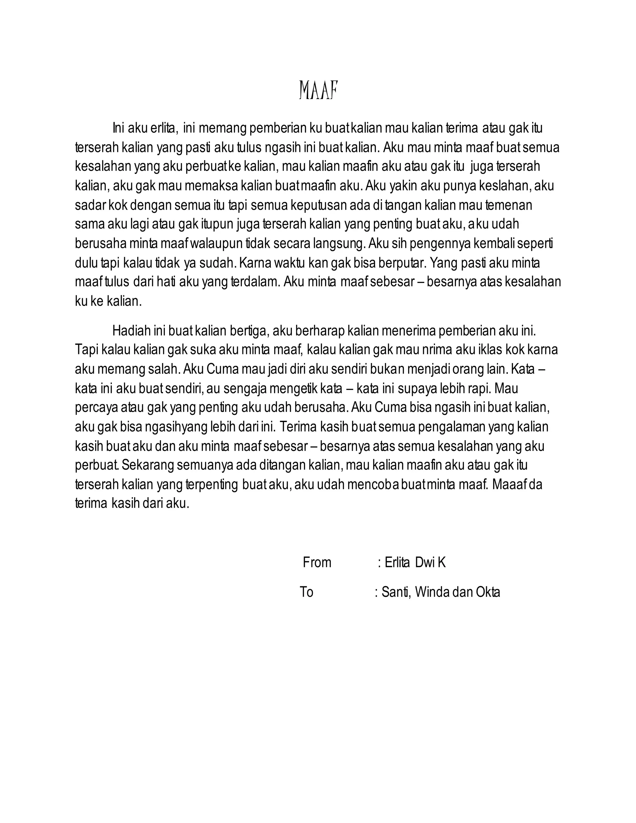Erlita meminta maaf secara tulus atas kesalahannya kepada Santi, Winda, dan Okta. Ia mengakui kesalahannya dan menyadari bahwa keputusan untuk memaafkannya atau tidak ada di tangan mereka. Erlita berharap dapat kembali berteman dengan mereka meski ia akan menerima keputusan apapun.