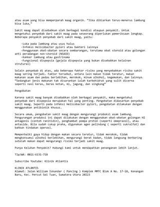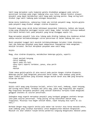 Sakit maag atau sindrom dispepsia merupakan gangguan pada saluran pencernaan yang ditandai dengan gejala seperti nyeri perut, mual, dan muntah. Penyebabnya meliputi infeksi bakteri, penggunaan obat-obatan, kanker lambung, dan gaya hidup buruk. Pengobatannya meliputi mengurangi produksi asam lambung, memperbaiki pola makan, serta mengobati penyebab utamanya.