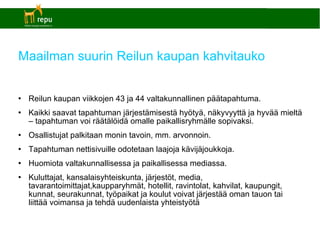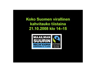 Maailman suurin Reilunkaupan kahvitauko Reilun kaupan viikkojen 43 ja 44 valtakunnallinen päätapahtuma. Kaikki saavat tapahtuman järjestämisestä hyötyä, näkyvyyttä ja hyvää mieltä – tapahtuman voi räätälöidä omalle paikallisryhmälle sopivaksi. Osallistujat palkitaan monin tavoin, mm. arvonnoin. Tapahtuman nettisivuille odotetaan laajoja kävijäjoukkoja. Huomiota valtakunnallisessa ja paikallisessa mediassa. Kuluttajat, kansalaisyhteiskunta, järjestöt, media, tavarantoimittajat,kaupparyhmät, hotellit, ravintolat, kahvilat, kaupungit, kunnat, seurakunnat, työpaikat ja koulut voivat järjestää oman tauon tai liittää voimansa ja tehdä uudenlaista yhteistyötä