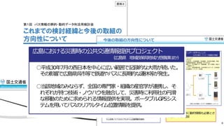 災害時のバスロケが検討課 題に • バスロケメーカーも参加 – NECネクサソリューソンズ – 国際興業 – ユニトランド 国交省「バス情報の静的・動的データ利活用検討会」 で技術を標準化