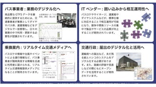 ダイヤデータ、営業データ、車両 データ、労務データなどを一元管理 • 結果的に最新のデータが常に 作成出来る体制 バス事業者: 業務のデジタル化で継続的データ整備