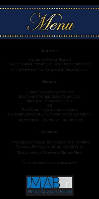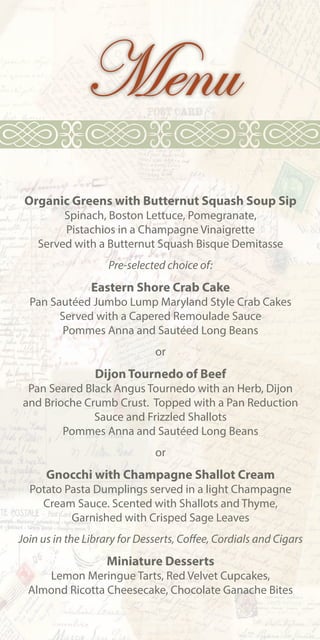 This document provides a sample menu that includes: - A starter salad course of sweet gem lettuce, blue cheese mousse, crispy pancetta, and tarragon vinaigrette. - Two entrée options - braised bison short rib or pan seared halibut, both served with vegetable sides. - A dessert of bittersweet Belgian chocolate terrine with vanilla streusel, berry compote, and mascarpone whipped cream. - An appetizer option of organic greens with butternut squash soup. - Three pre-selected entrée choices - crab cakes, Dijon beef, or gnocchi in champagne cream sauce, all with