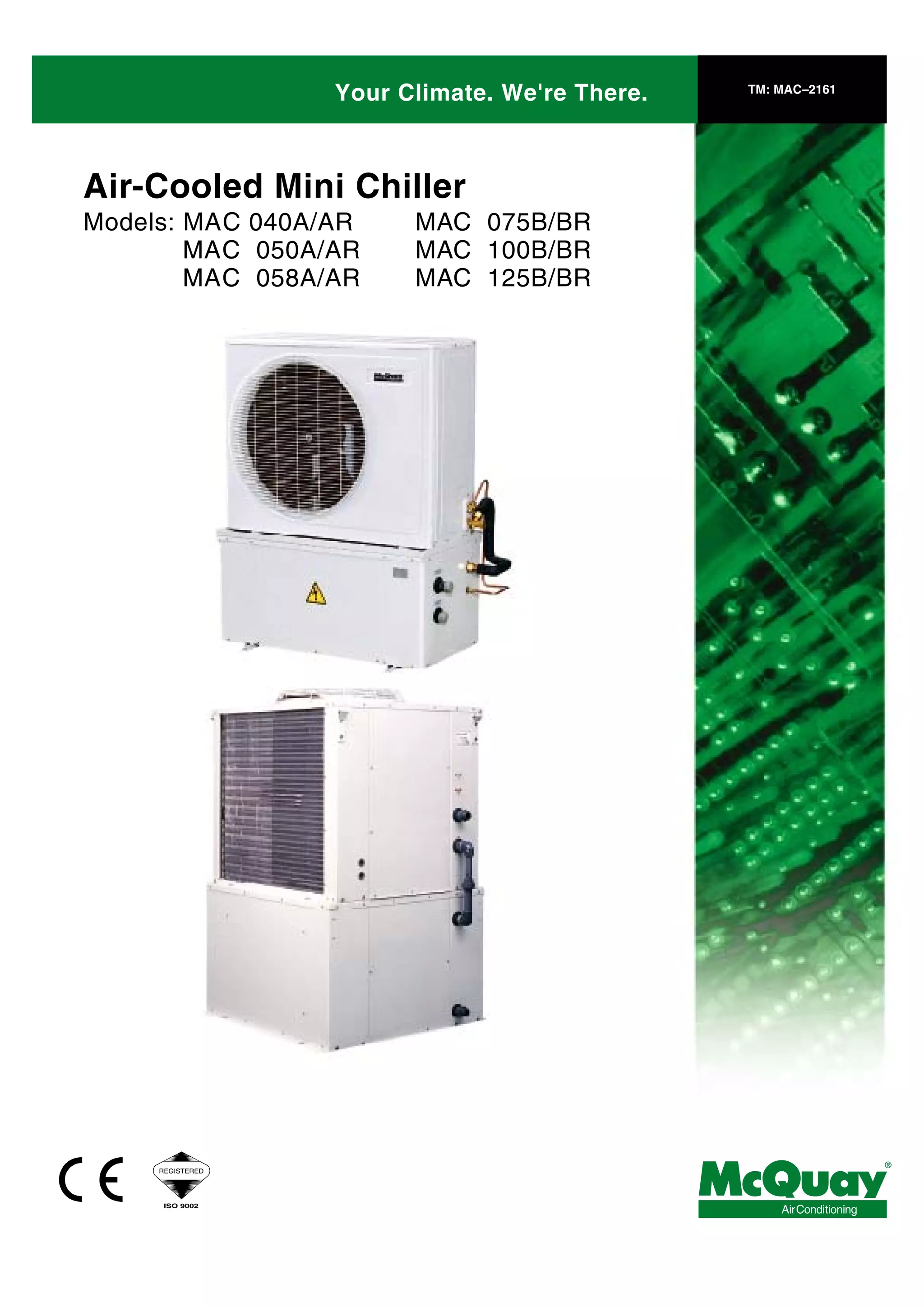 This document provides specifications for MacQuay mini air-cooled chiller models MAC 040A/AR through MAC 125B/BR. It details the units' features such as their compact design with separate refrigerant and water circuits, environmentally friendly R22 refrigerant charging, and versatility to couple with fan coil units. It also provides information on the units' components, refrigeration circuit, safety controls, antifreeze protection, standard factory settings, and microprocessor controller functions.