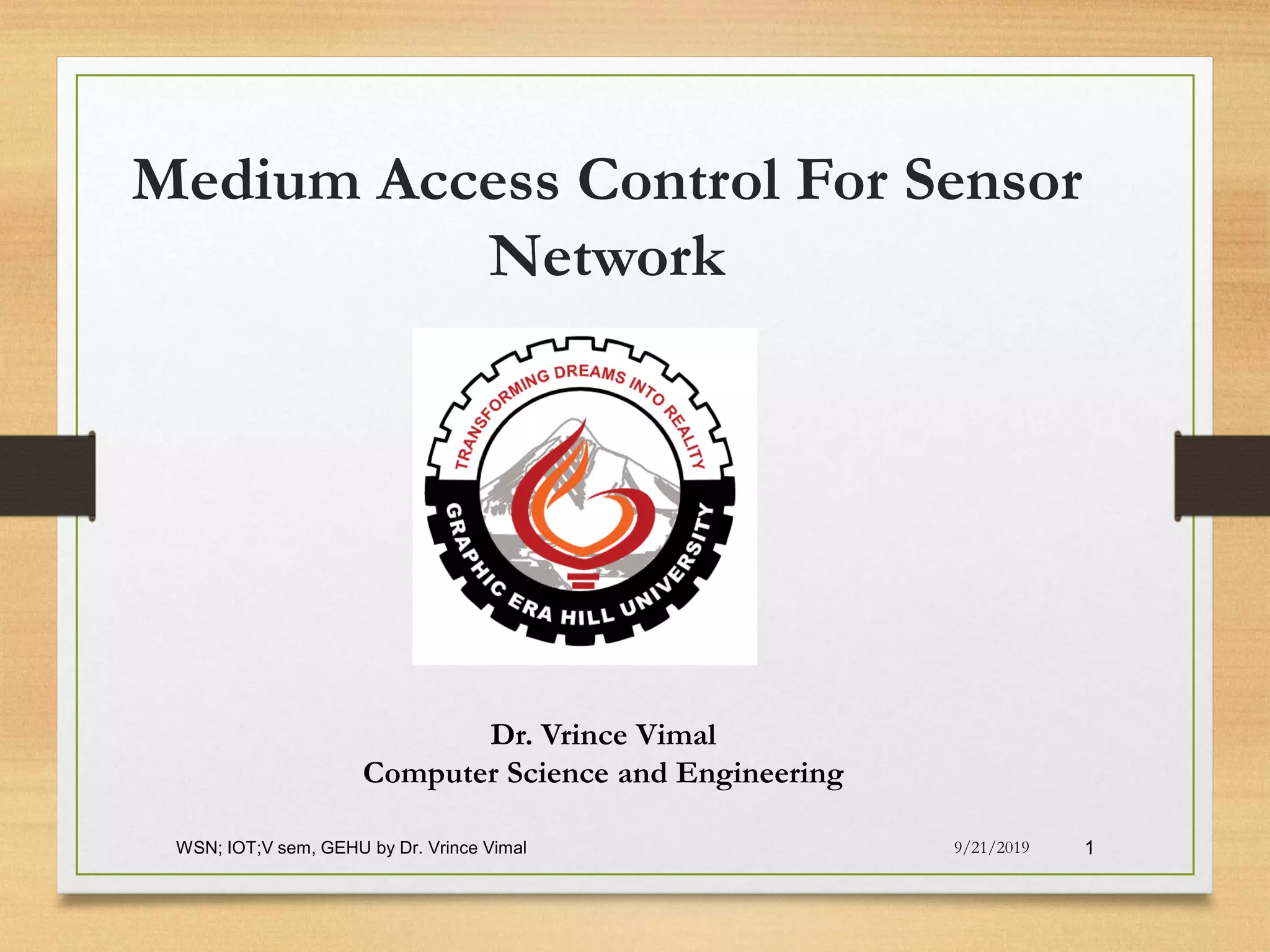 The document presents an in-depth analysis of Medium Access Control (MAC) protocols for Wireless Sensor Networks (WSN), focusing on their classification into scheduled-based and contention-based MAC. Key MAC protocols discussed include S-MAC, T-MAC, and various Time Division Multiple Access (TDMA) variants, emphasizing energy efficiency and network performance. Additionally, it covers the IEEE 802.15.4 MAC protocol and Zigbee's application in IoT systems.