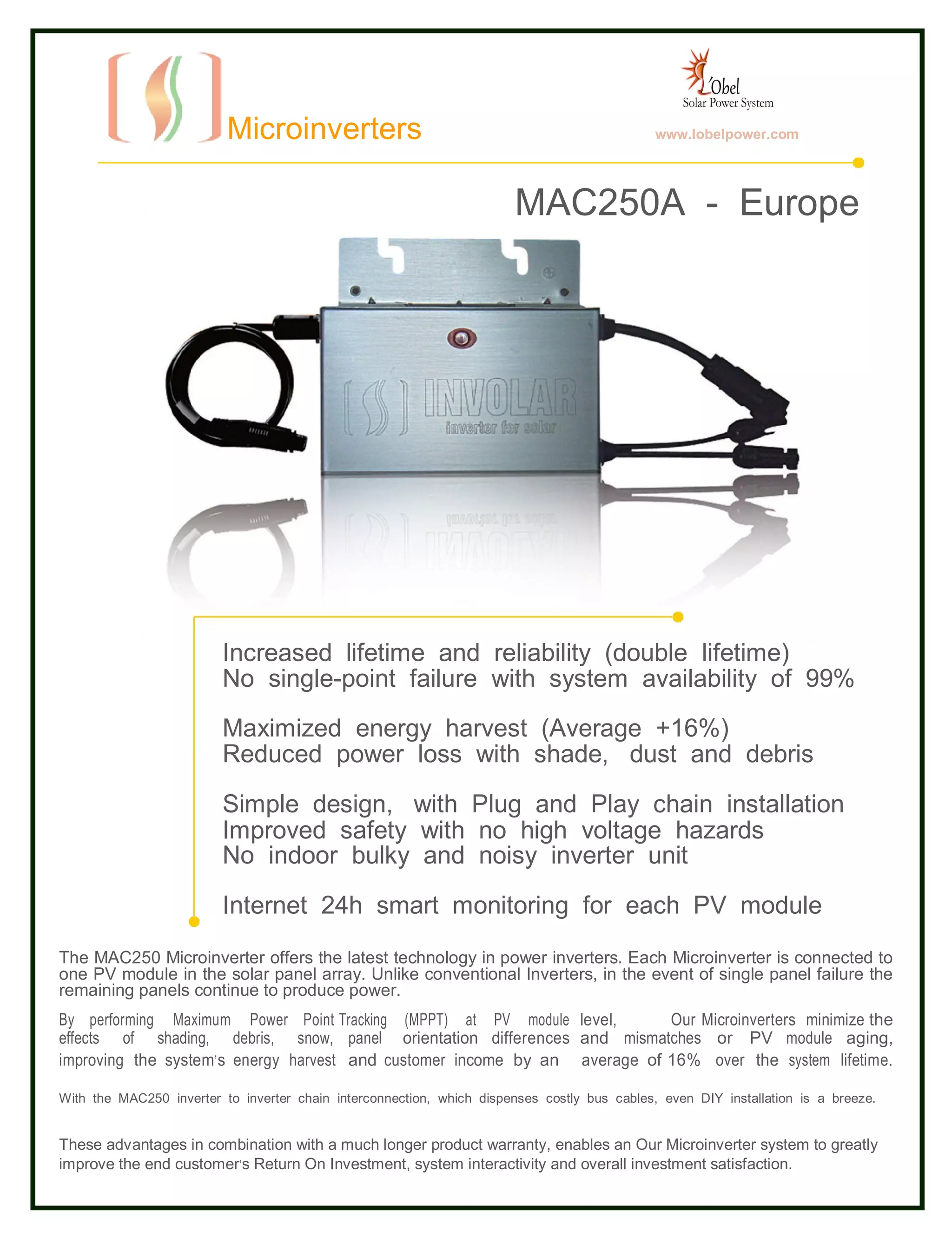 The mac250a microinverter provides enhanced reliability with a double lifetime and 99% system availability, allowing continuous power production even if one panel fails. It maximizes energy harvest by 16% through effective shade and debris management with a simple plug-and-play installation design. This microinverter is designed for both efficiency and safety, featuring a long warranty period that boosts customer satisfaction and investment returns.