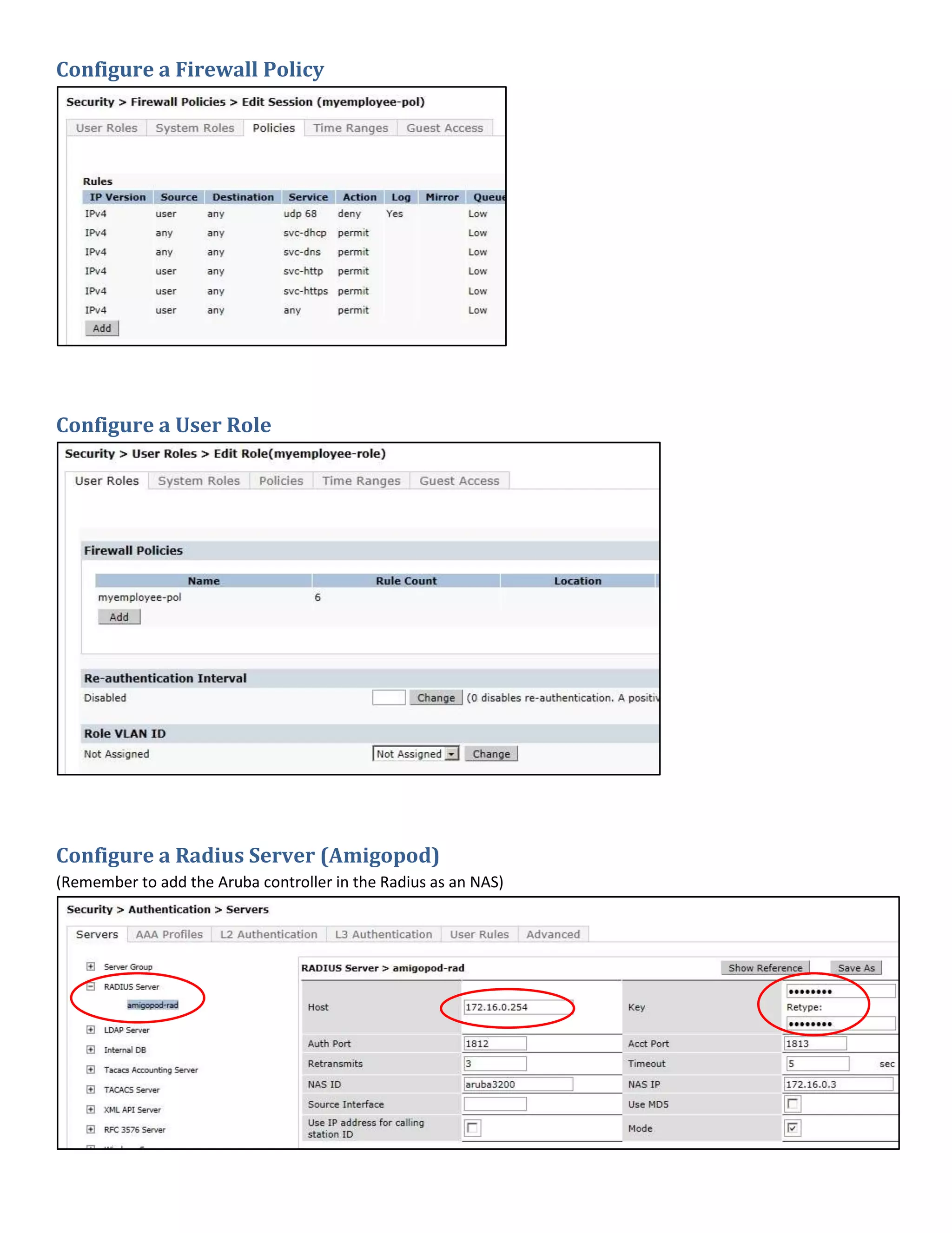 1. This document provides instructions for configuring MAC address authentication using a RADIUS server on an Aruba wireless controller and Amigopod RADIUS server.
