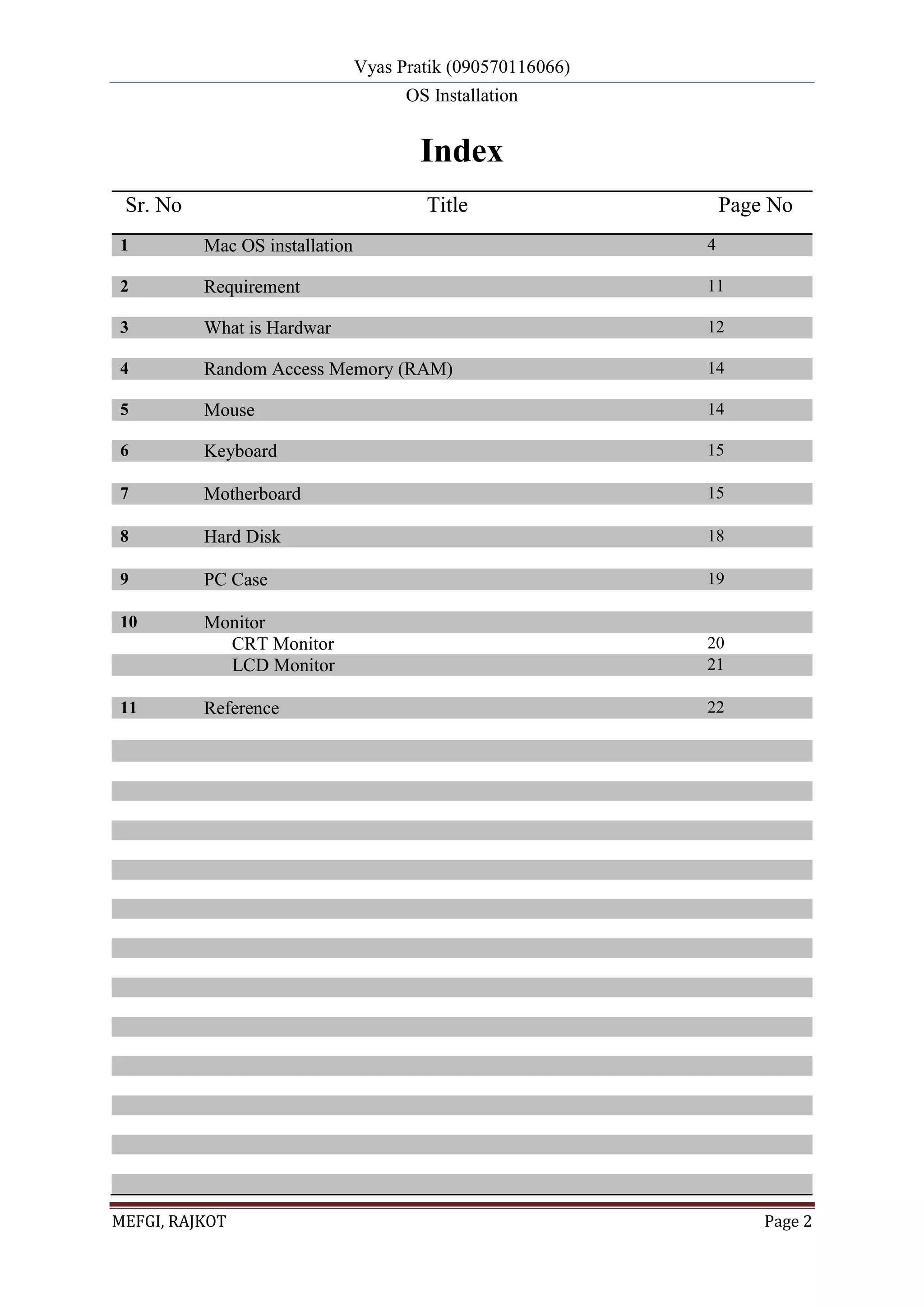 The document is a project report on the installation of Mac OS, detailing the step-by-step process required for installation along with necessary hardware requirements. It covers the installation steps such as selecting a destination, installation options, and custom software packages. Additionally, it explains various computer hardware components, including the motherboard, RAM, and monitors.