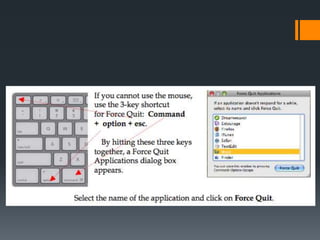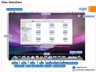 The document provides an introduction to Mac computers and the Mac OS X operating system. It discusses what Macs are, the current Mac models including Mac Mini, iMac, Mac Pro, MacBook, MacBook Pro and MacBook Air. It also summarizes the different versions of Mac OS X from Cheetah to Mountain Lion and the reasons for using Mac OS X over older Mac operating systems. Finally, it outlines some common desktop icons, applications that come with OS X and other essential Mac functions.