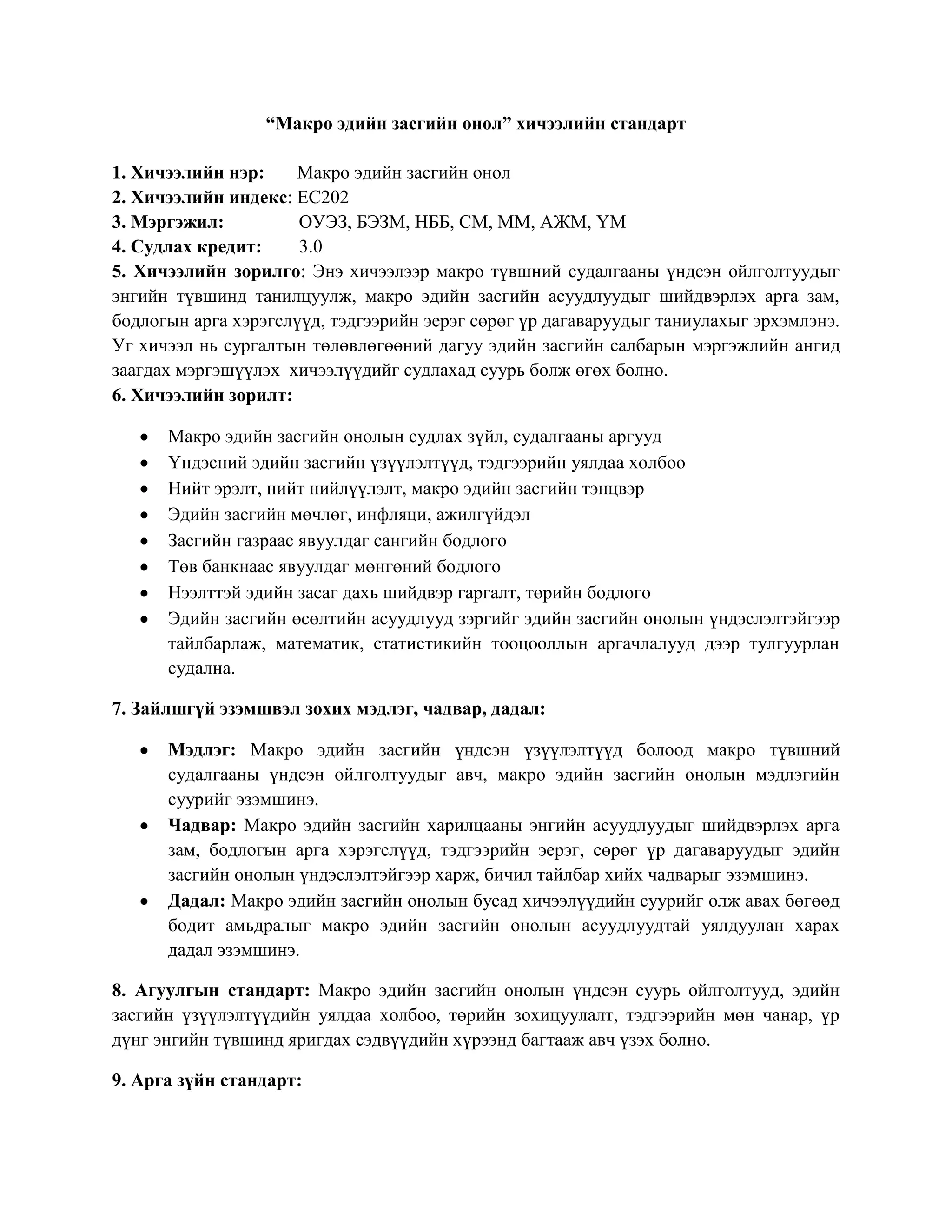 “Макро эдийн засгийнонол” хичээлийн стандарт