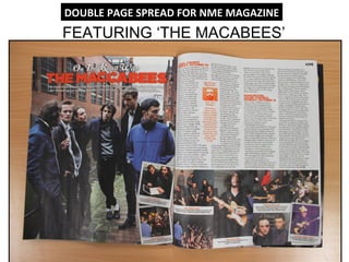 The double page spread features the indie rock band The Macabees in NME Magazine. A variety of informal, candid photos from gigs and backstage are used. The main image on the left page shows the band looking disinterested. Smaller polaroid-style images spill onto the opposite page to connect the two. Bold orange and blue colors are used throughout in a grungy style befitting the band. Mixing fonts maintain clarity while overlapping text elements enhance cohesion. The informal, colorful presentation targets NME's young, creative readership interested in indie music.