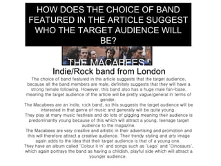 The Macabees are featured in the article. They are an indie/rock band from London that will attract a young audience interested in that genre of music. The language used in the article is informal and casual to be accessible to a wide readership. Bright colors like orange and blue are used in the design which relates to the band's grungy rock and roll style. Images appear to be candid shots from concerts and portray the band as fun and playful.