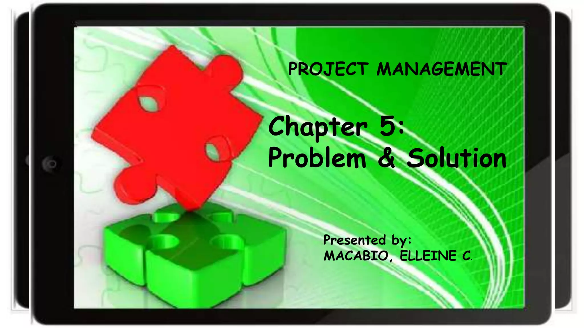 The document discusses problems, solutions, and the process of turning a problem into a project. It defines the 5 parts of a problem as the crisis, symptom, consequence, cause, and root cause. It then explains tools to help define the problem, such as organizing problems by those under your control, those you can influence, and those you can't control. Finally, it outlines the process of choosing the best solution, which involves picturing the solution, determining if more information or expertise is needed, listing options, and potentially making a decision.
