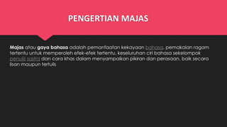 Majas atau gaya bahasa adalah penggunaan bahasa yang kreatif untuk menciptakan efek tertentu. Terdapat beberapa jenis majas seperti majas perbandingan, penegasan, dan pertentangan. Majas perbandingan meliputi simile, personifikasi, dan metafora. Sedangkan majas penegasan mencakup repetisi, klimaks, antiklimaks, dan paralelisme. Majas pertentangan terdiri dari paradoks, hiperbolisme, dan antitesis
