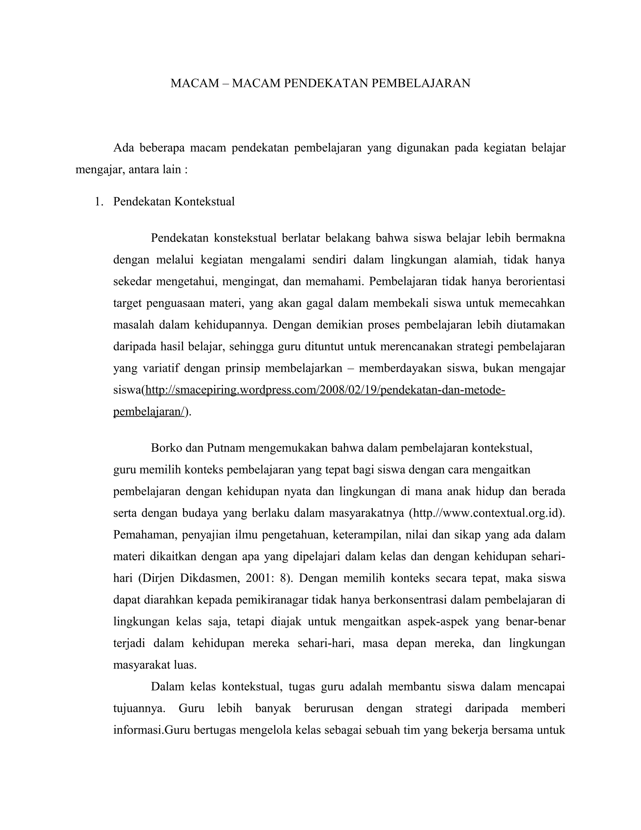 Ada beberapa pendekatan pembelajaran yang dijelaskan dalam dokumen tersebut, yaitu pendekatan kontekstual, konstruktivisme, deduktif-induktif, konsep dan proses, serta sains, teknologi dan masyarakat. Pendekatan-pendekatan tersebut berfokus pada pembelajaran yang bermakna bagi siswa dengan menghubungkan materi pelajaran dengan konteks kehidupan nyata.