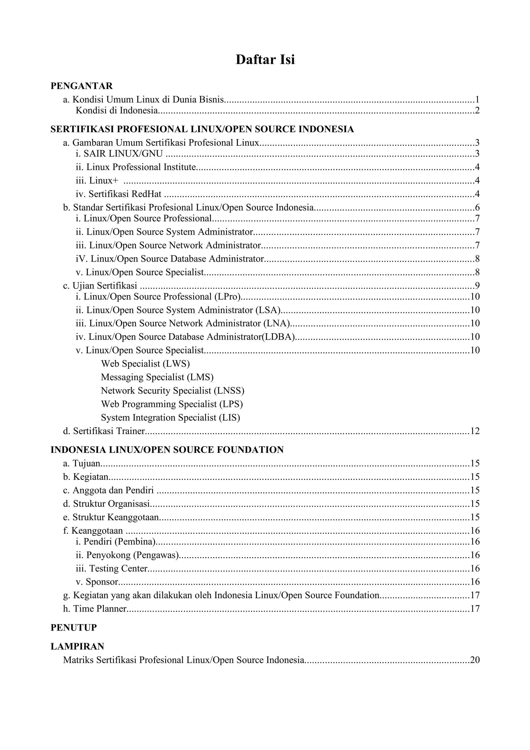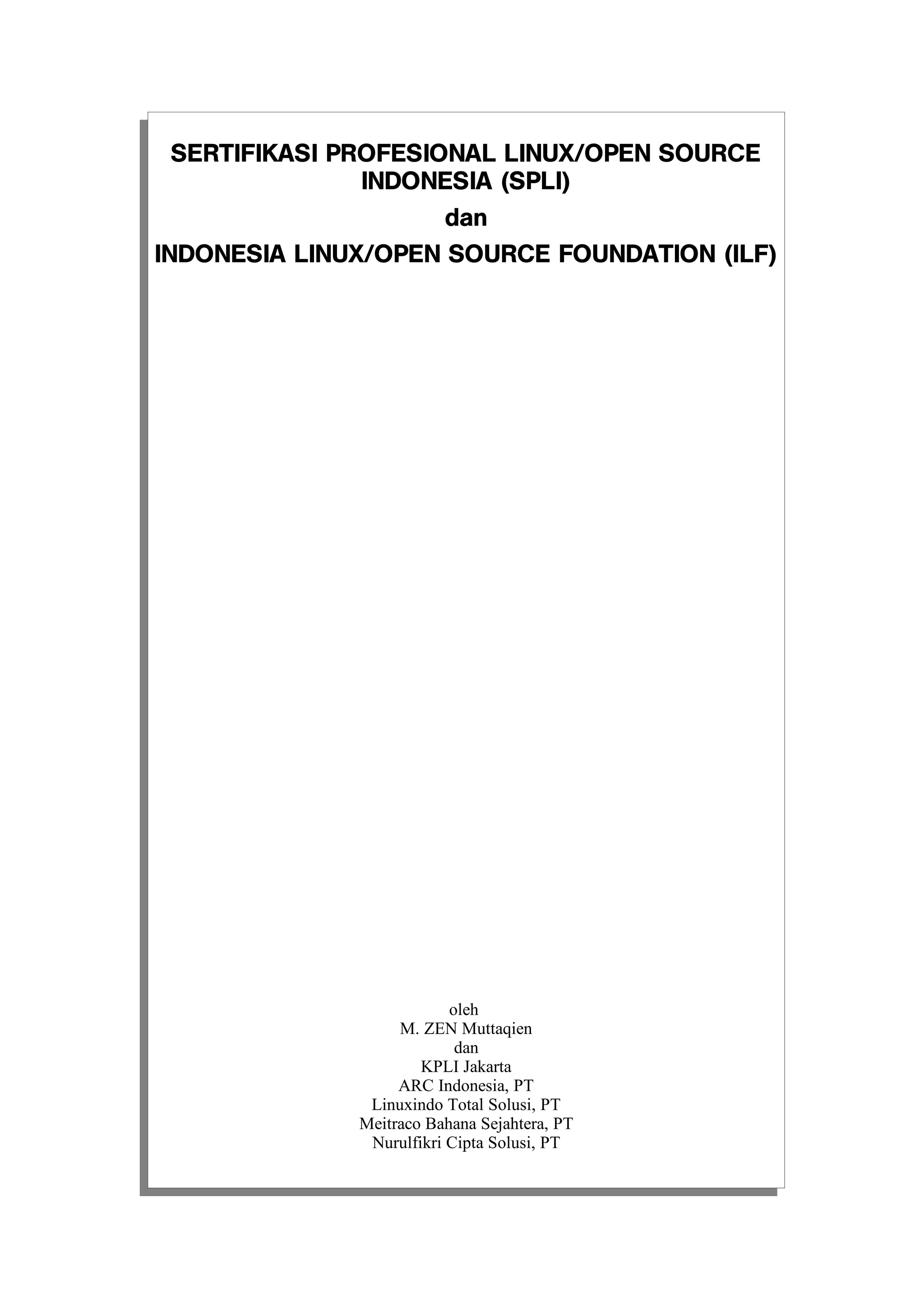 Dokumen ini membahas pentingnya sertifikasi profesional di bidang Linux dan open source di Indonesia, dengan tujuan untuk menciptakan standar sertifikasi yang komprehensif dan independen terhadap distribusi tertentu. Sertifikasi ini diperlukan untuk menjembatani kesenjangan antara komunitas dan industri, serta untuk memenuhi kebutuhan SDM berkualitas di sektor ini. Indonesia Linux/Open Source Foundation akan berperan dalam mengembangkan dan menerapkan standar sertifikasi profesional Linux yang sesuai dengan kondisi lokal.