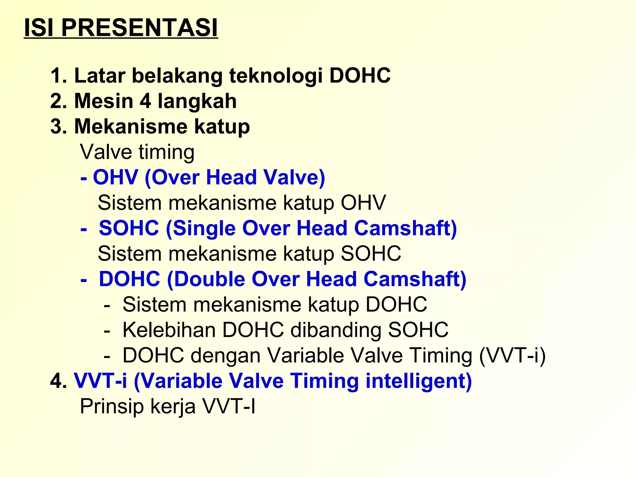 Dokumen ini membahas teknologi DOHC (Double Overhead Camshaft) dan VVT-i (Variable Valve Timing Intelligent) pada mesin Daihatsu, menjelaskan latar belakang, mekanisme, dan perbandingan dengan SOHC (Single Overhead Camshaft). Ditekankan bahwa DOHC + VVT-i memberikan keunggulan dalam performa mesin, efisiensi bahan bakar, dan memenuhi standar emisi lingkungan. Kesimpulannya, DOHC lebih sederhana dalam konstruksi dan perawatan, serta lebih ramah lingkungan dibandingkan teknologi lainnya.